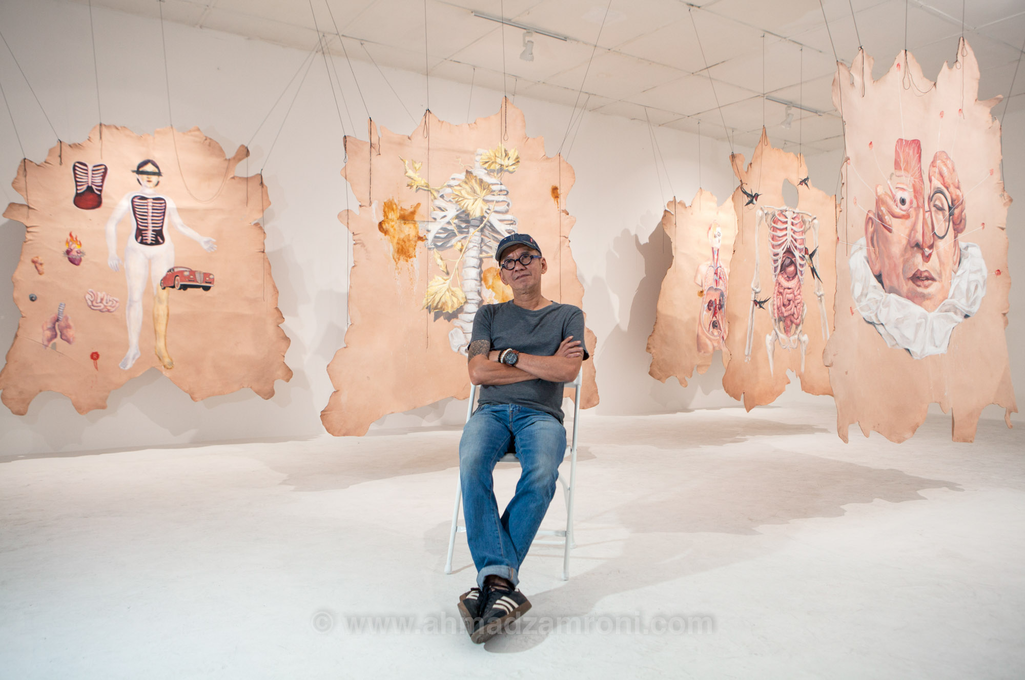 Agus Suwage dan karyanya ‘Anatomy od Desire #2’ 2017 | Oil on cow skin. Art|Jog 2017, Yogyakarta, Indonesia. Photo by Ahmad Zamroni