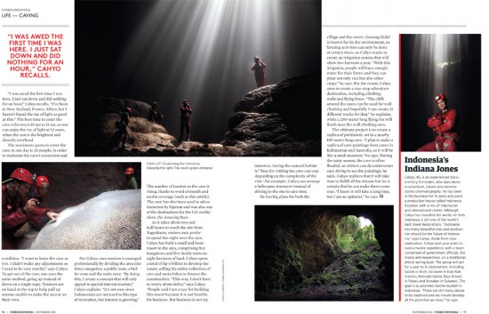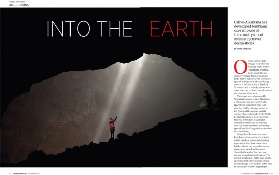 My travel photo story about Jomblang and Grubug cave, which have a depth around 100 m (328.084 ft) at Gunung Kidul area in Yogyakarta, featured at Forbes Indonesia Magazine and Forbes Asia (November 2012 Issue).