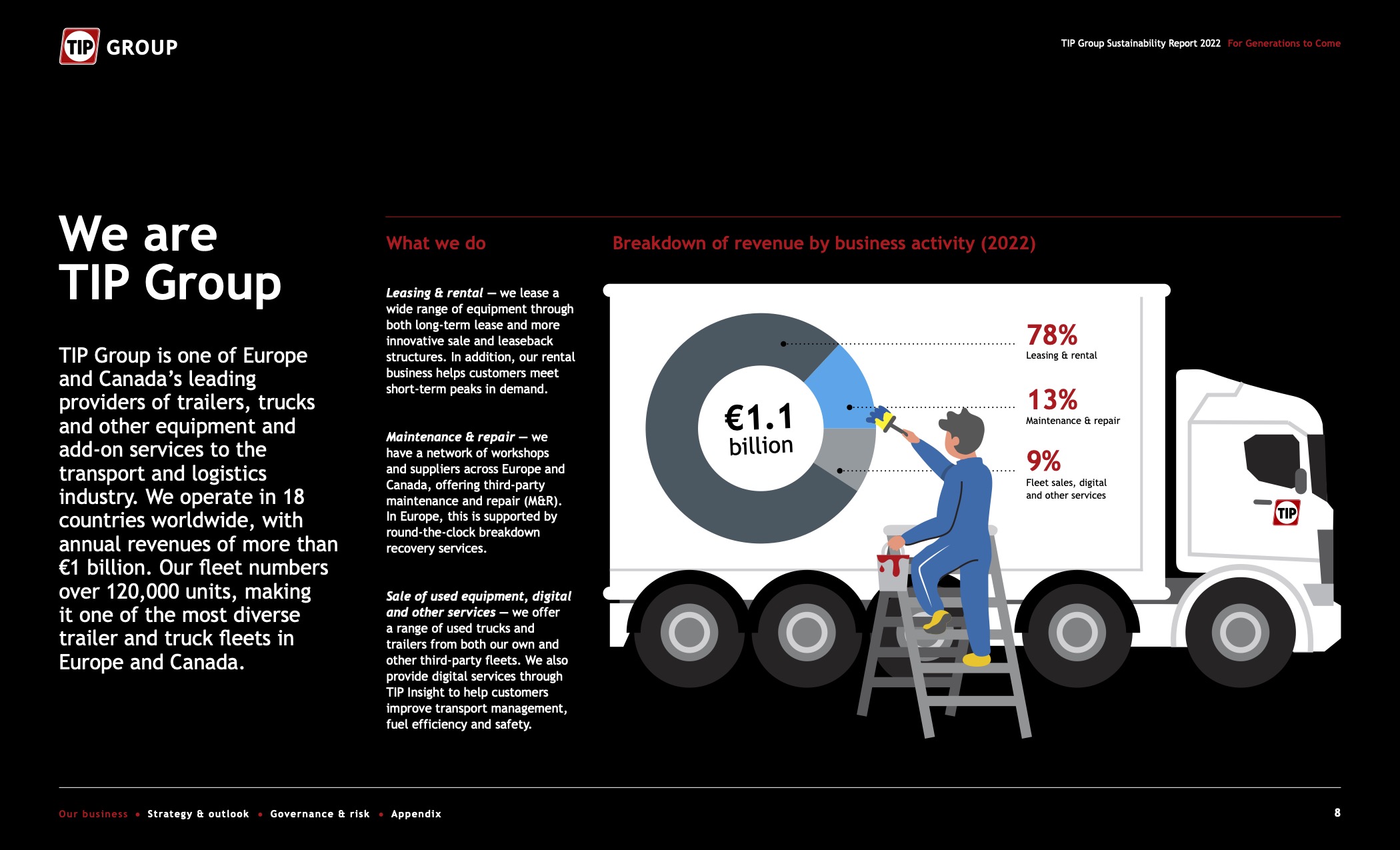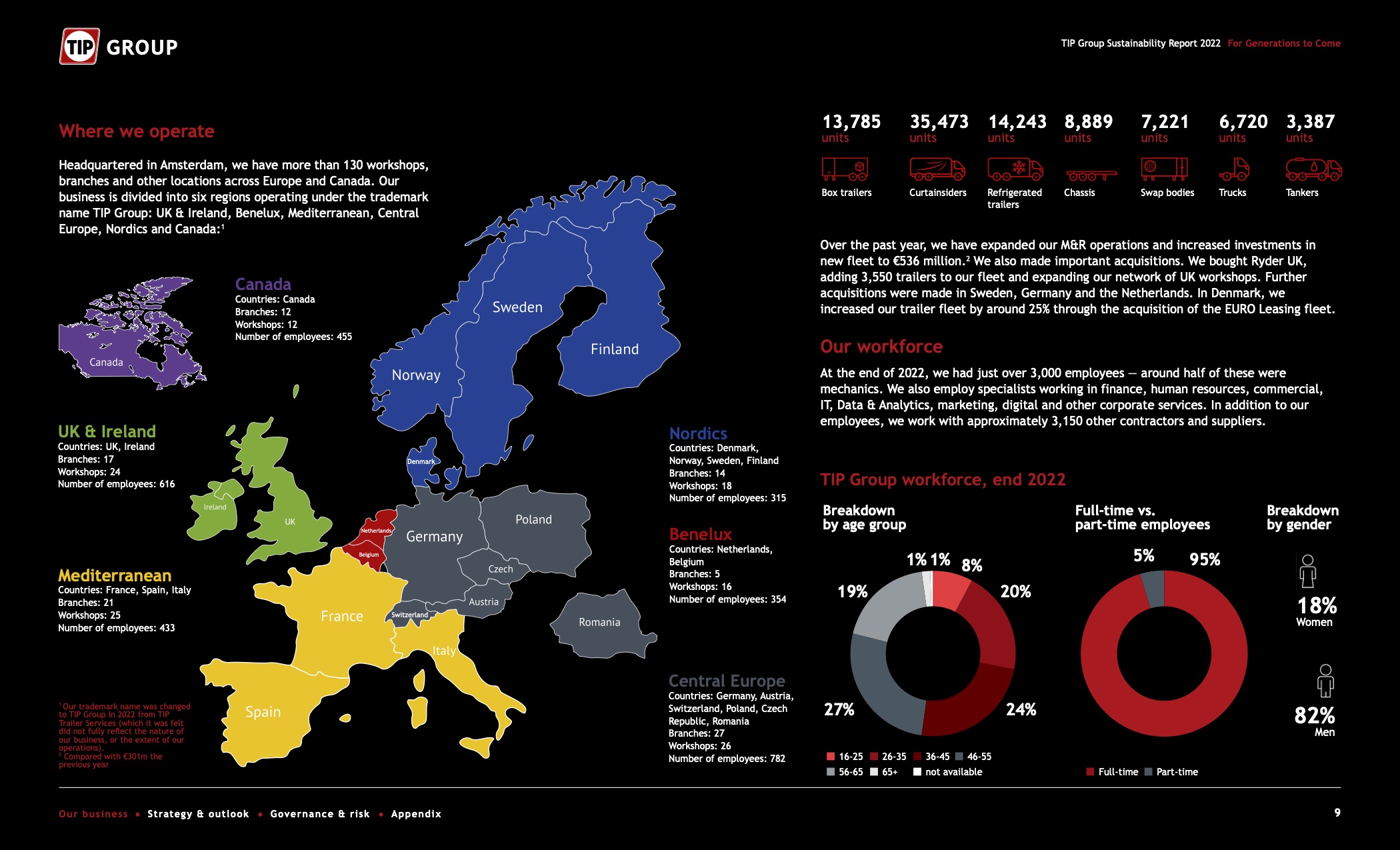 TIP Group is one of Europe and Canada’s leading providers of trailers, trucks and other equipment and add-on services to the transport and logistics industry. We operate in 18 countries worldwide, with annual revenues of more than €1 billion. Their fleet numbers over 120,000 units, making it one of the most diverse trailer and truck fleets in Europe and Canada.